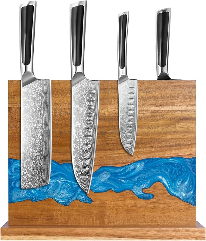 Handcrafted acacia wood magnetic knife block with stunning blue resin river design