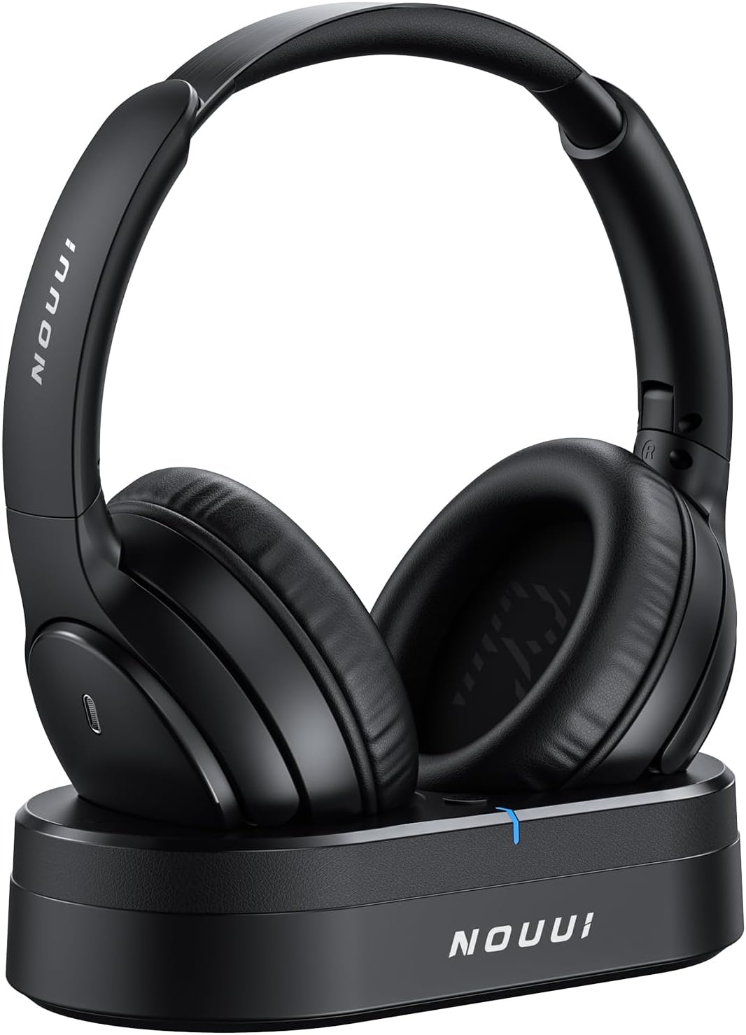 Bluetooth headphones with transmitter charging base for plug‑and‑play TV connection